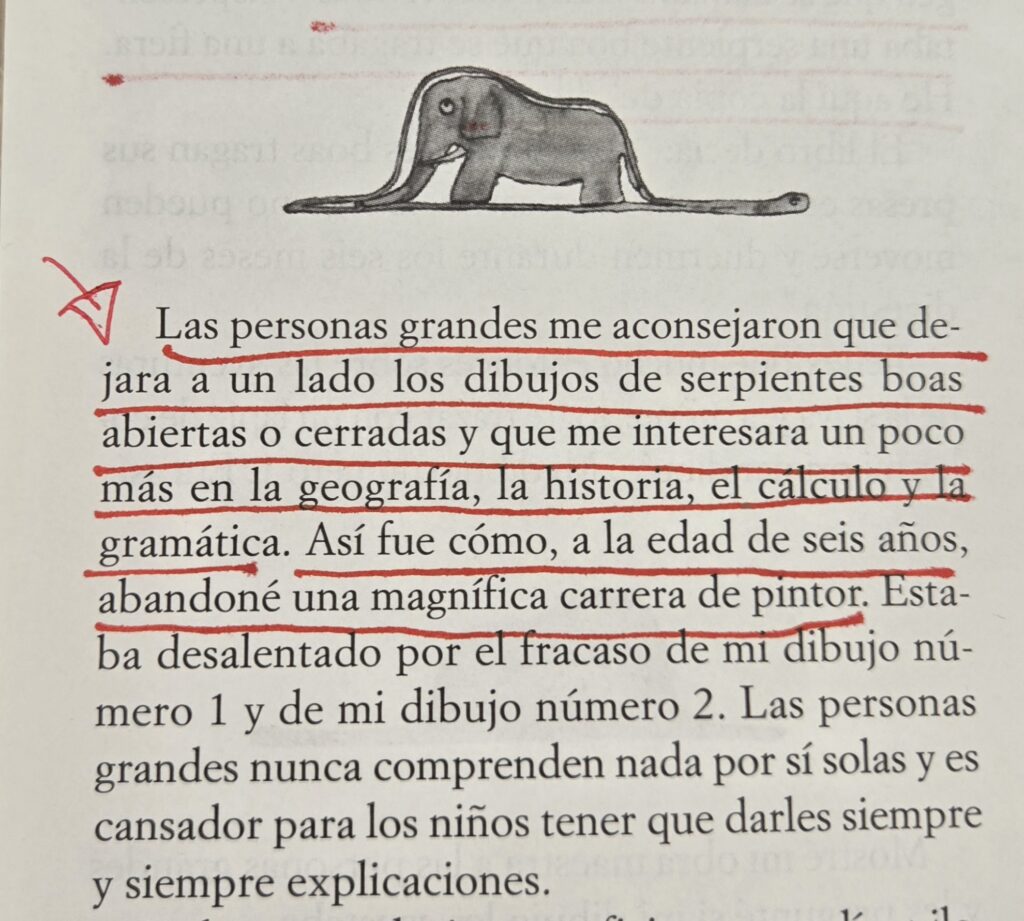 El Principito va mucho más allá de la literatura infantil. Es un libro que nos recuerda la necesidad de conectar con lo esencial, con aquello que muchas veces dejamos de lado en la adultez: la imaginación, la empatía y la capacidad de asombro. Las primeras páginas dan una enseñanza que para mí es muy importante. Y es que en ocasiones somos los adultos que limitamos la imaginación y creatividad de nuestros hijos e hijas. Les pedimos que dejen de dibujar serpientes boas que se tragan elefantes y que se enfoquen en lo “verdaderamente importante” de la vida.